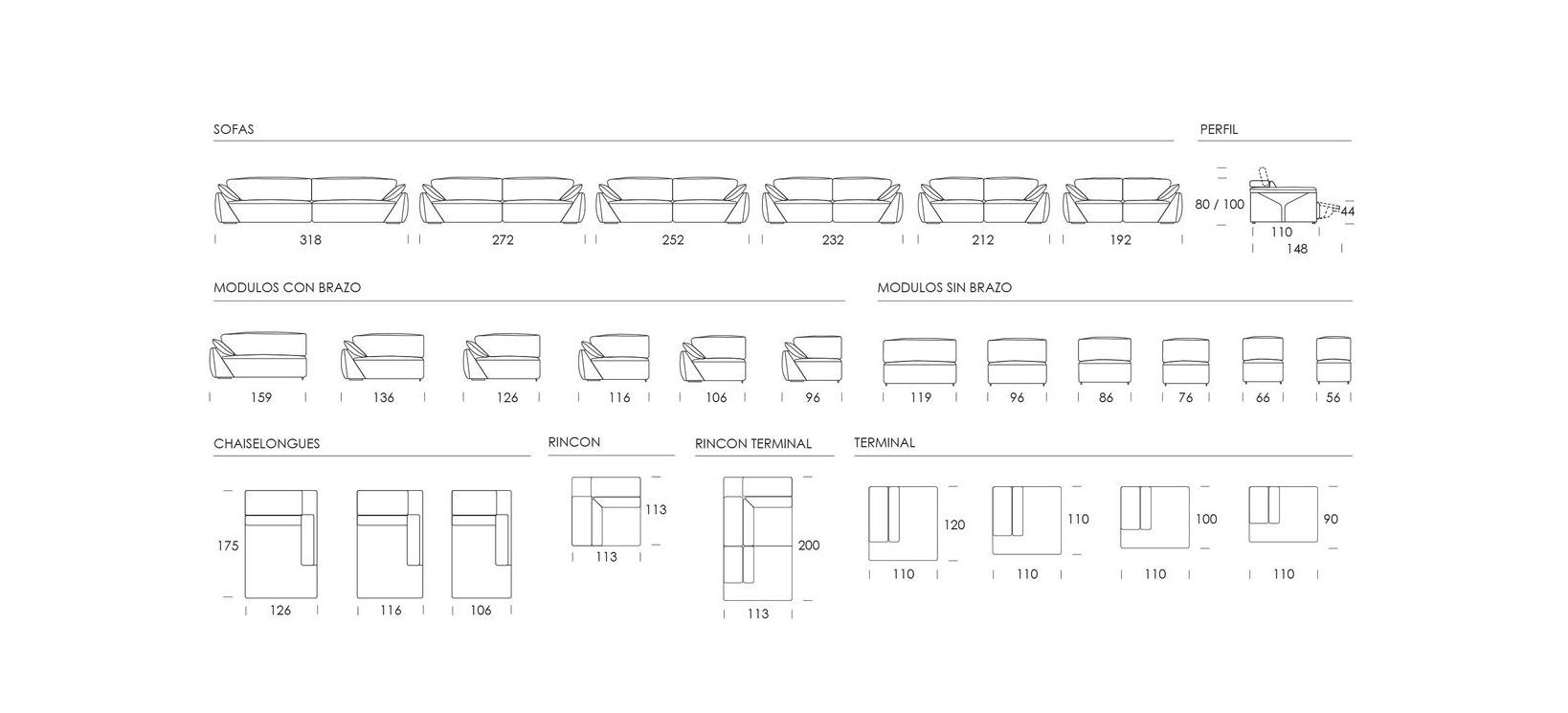 Folding backrests with chromed steel mechanism with multiple positions from 0º to 108º. Modules with motorised relaxation mechanism.