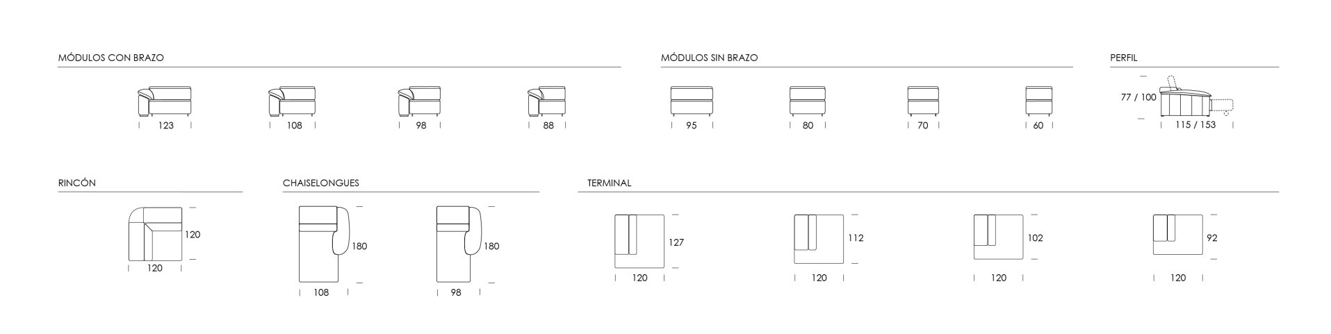 Folding backrests with chromed steel mechanism with multiple positions from 0º to 108º. Modules with removable mechanism convertible into a bed.